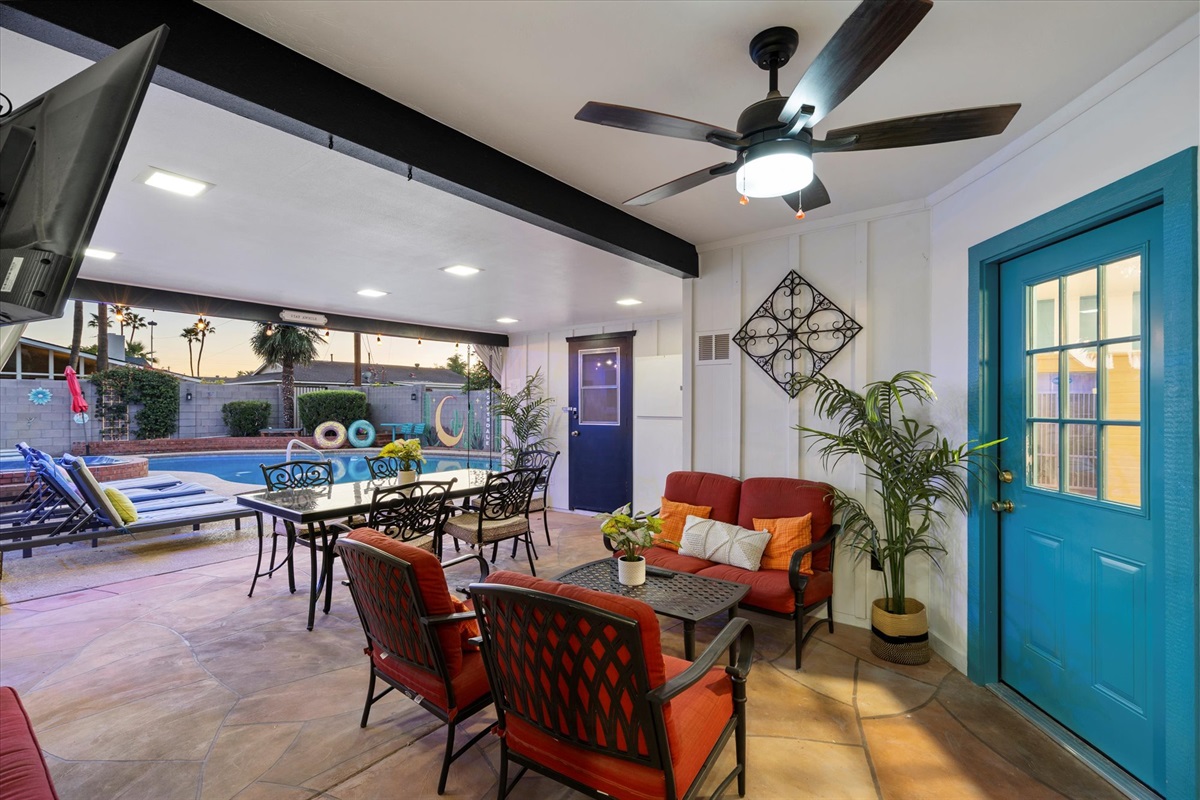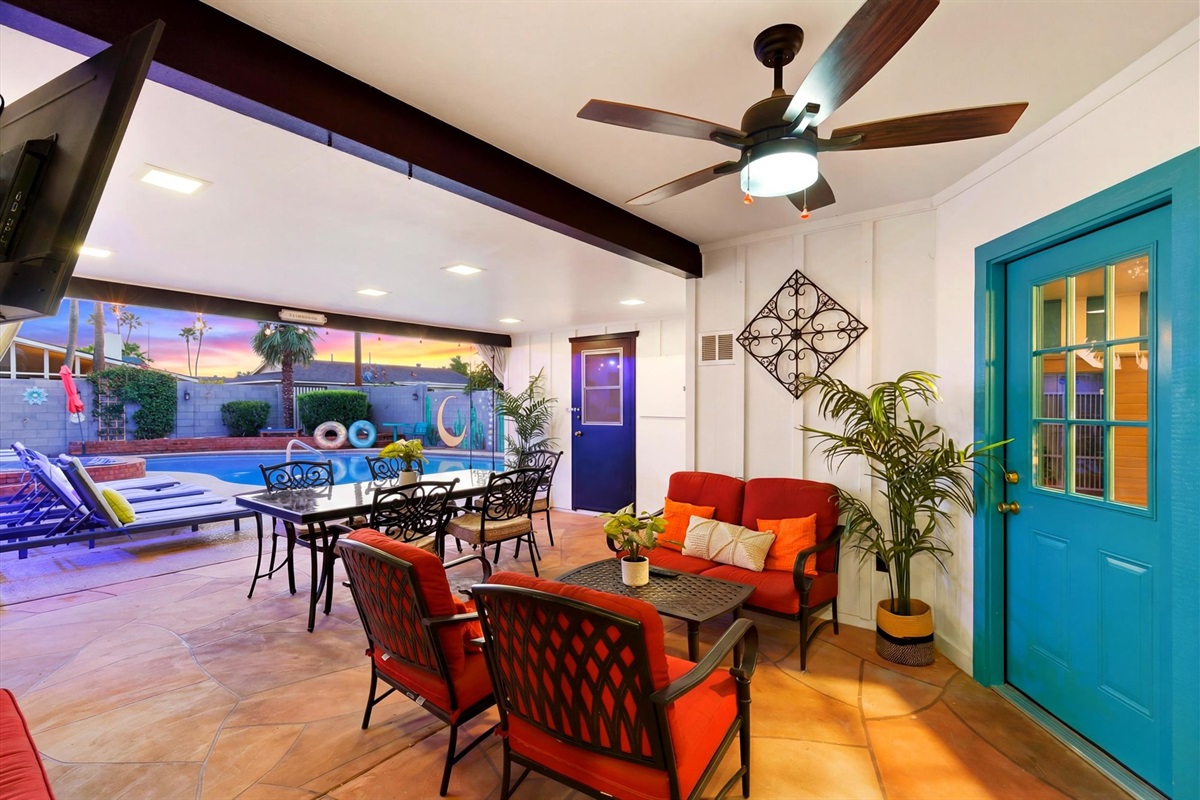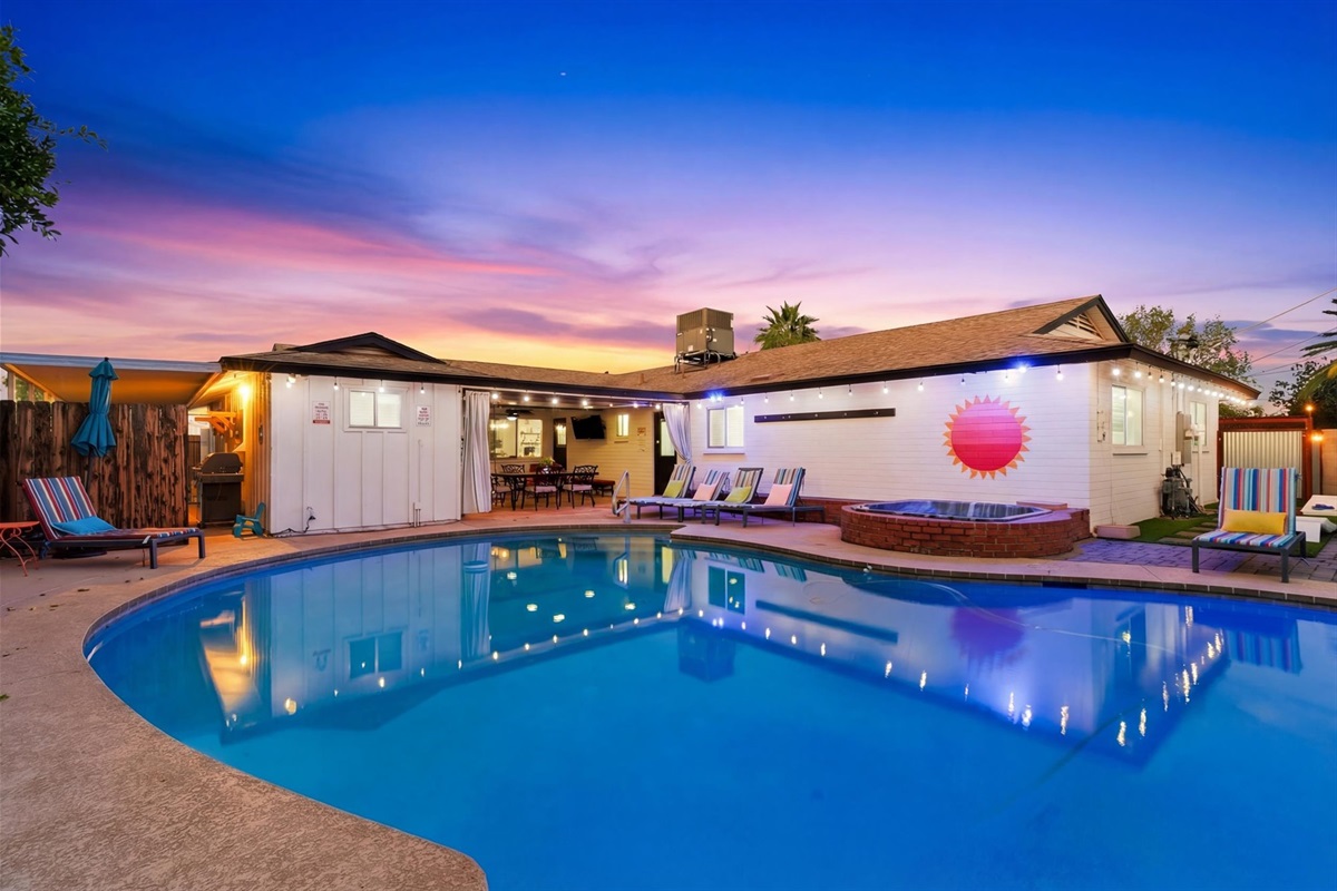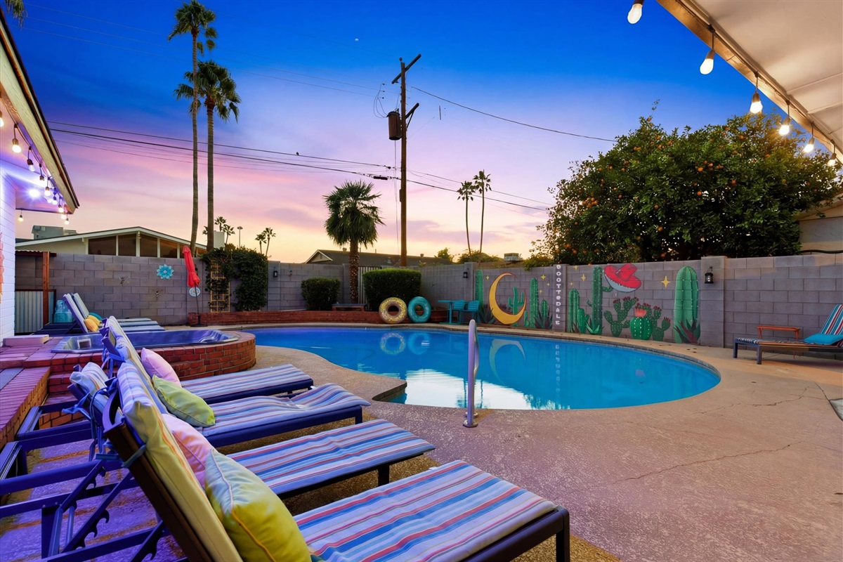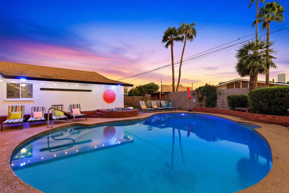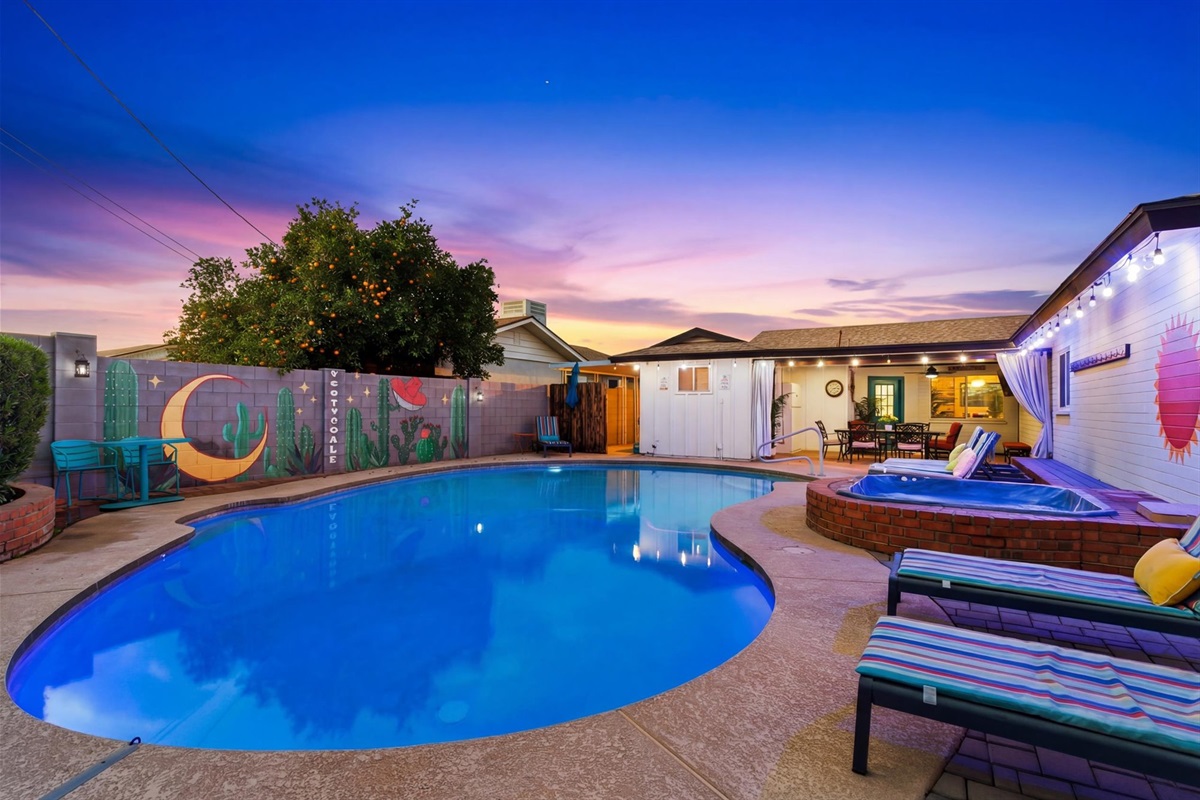 Step outside to your private backyard oasis with a heated pool, hot tub, loungers, and outdoor games—perfect for sunny afternoons and peaceful evenings under the Arizona sky.