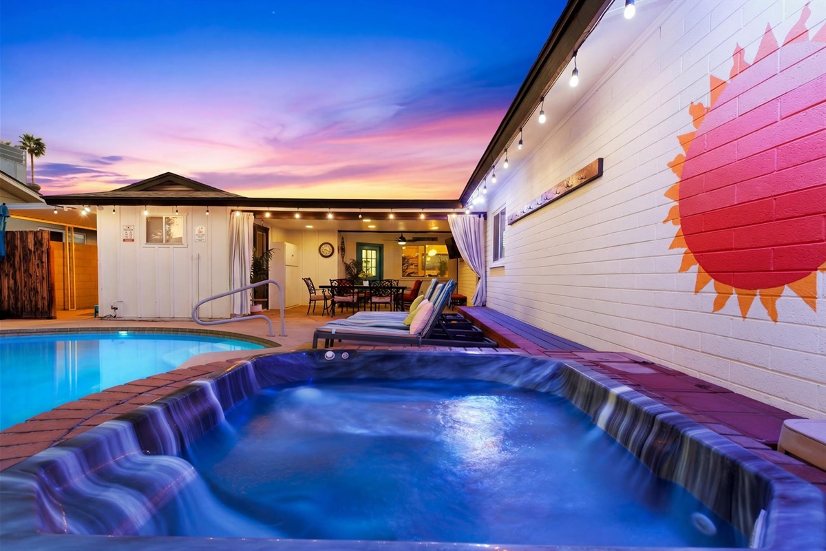 A Scottsdale stay designed for fun and restoration—featuring a private spa room, heated pool, hot tub, games, and warm desert nights under glowing outdoor lights. This five-bedroom desert-inspired home blends relaxed luxury with intentional wellness touches, making it perfect for families, friends, couples, and groups who want both fun and restoration in one unforgettable stay.